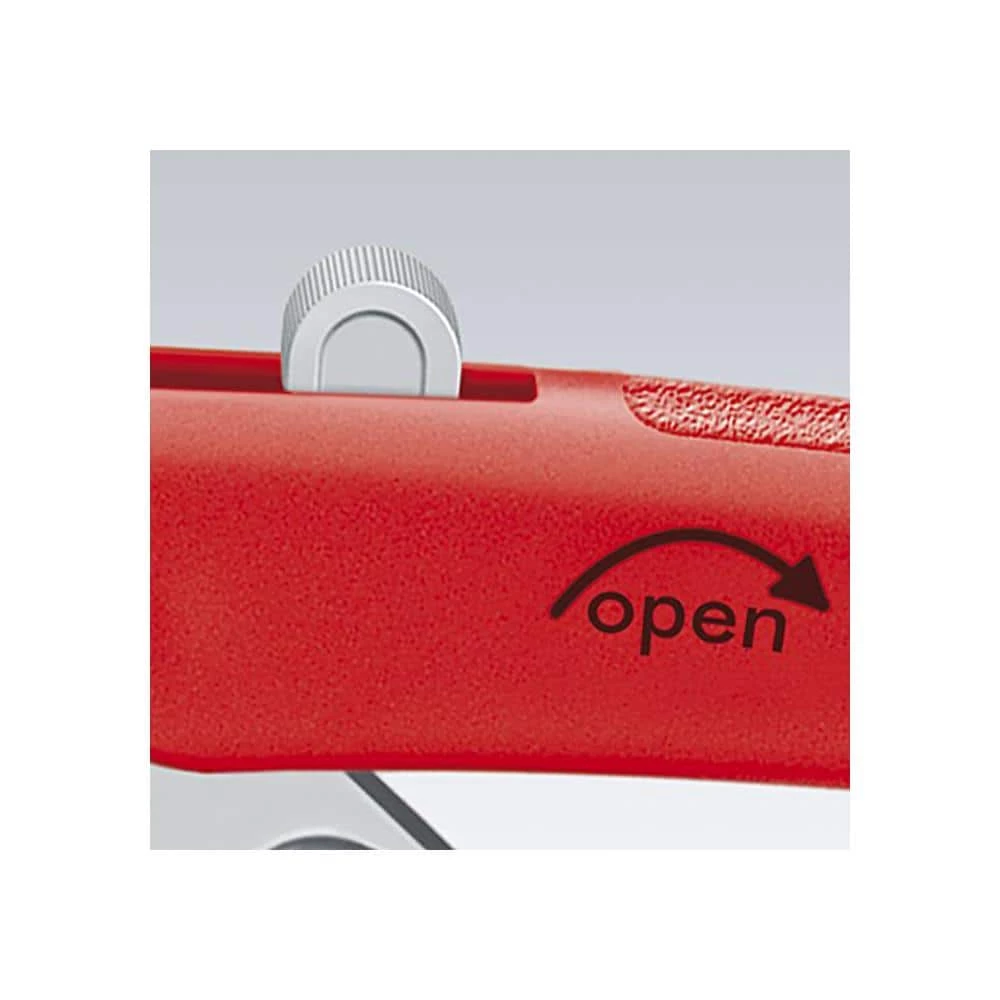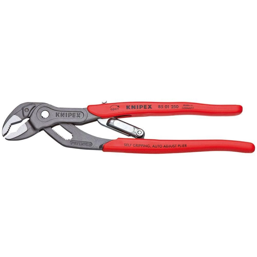 The KNIPEX 10 in. Auto Adjusting Pliers are ideal for frequent changeovers to workpieces of different sizes. The 1-handed automatic adjustment is perfect for right-handed and left-handed use. Good access to the workpiece thanks to the slim dimensions in the head and joint area and flush joint bolt. Self-locking on pipes up to 1-14/ in. and 1-3/8 in. nuts with no slipping on the workpiece and low hand force required. Gripping surfaces with special hardened teeth, teeth hardness approximately 61 HRC provide low wear and reliable gripping. The box-joint design provides high stability because of double guide. Pinch guard prevents operator’s fingers being pinched. Locking lever for space saving transport with reliable closed handles. Made of chrome vanadium electric steel, forged, oil-hardened.