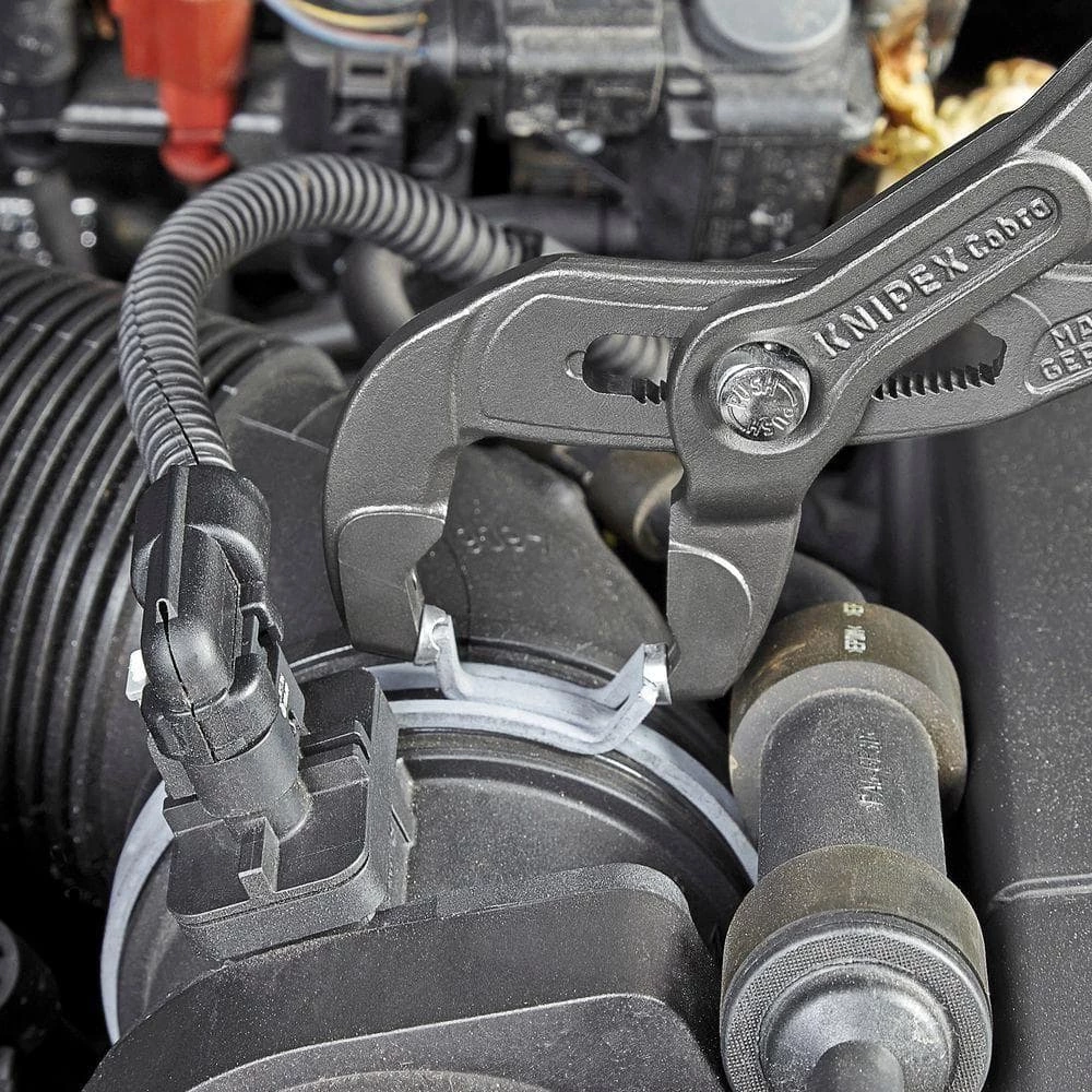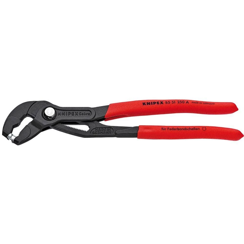 The KNIPEX 10 in. Cobra Spring Hose Clamp Pliers has rotatable, universal grip inserts for securely gripping the clamps in all positions. Extremely good leverage which allows clamps to be opened easily without great effort. Quick-set adjustment adjusts by shifting directly onto the workpiece. Slim head design narrow head width, rotatable grip inserts: an ideal tool, especially in confined areas. Can be used for standard, space-saving, spring wire hose clamps and for spring band clamps up to 70 mm nominal size. Maximum jaw opening 2-3/4 in. clamping range. Made of chrome vanadium electric steel, forged, oil-hardened.