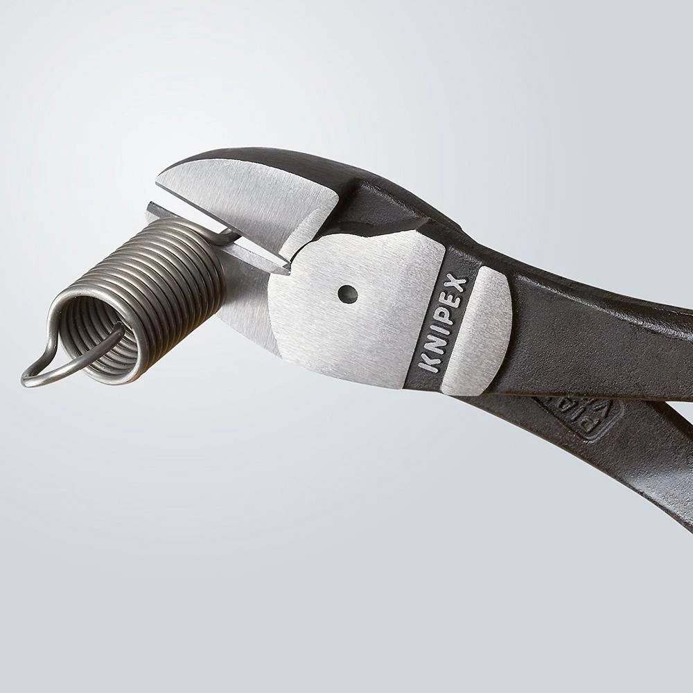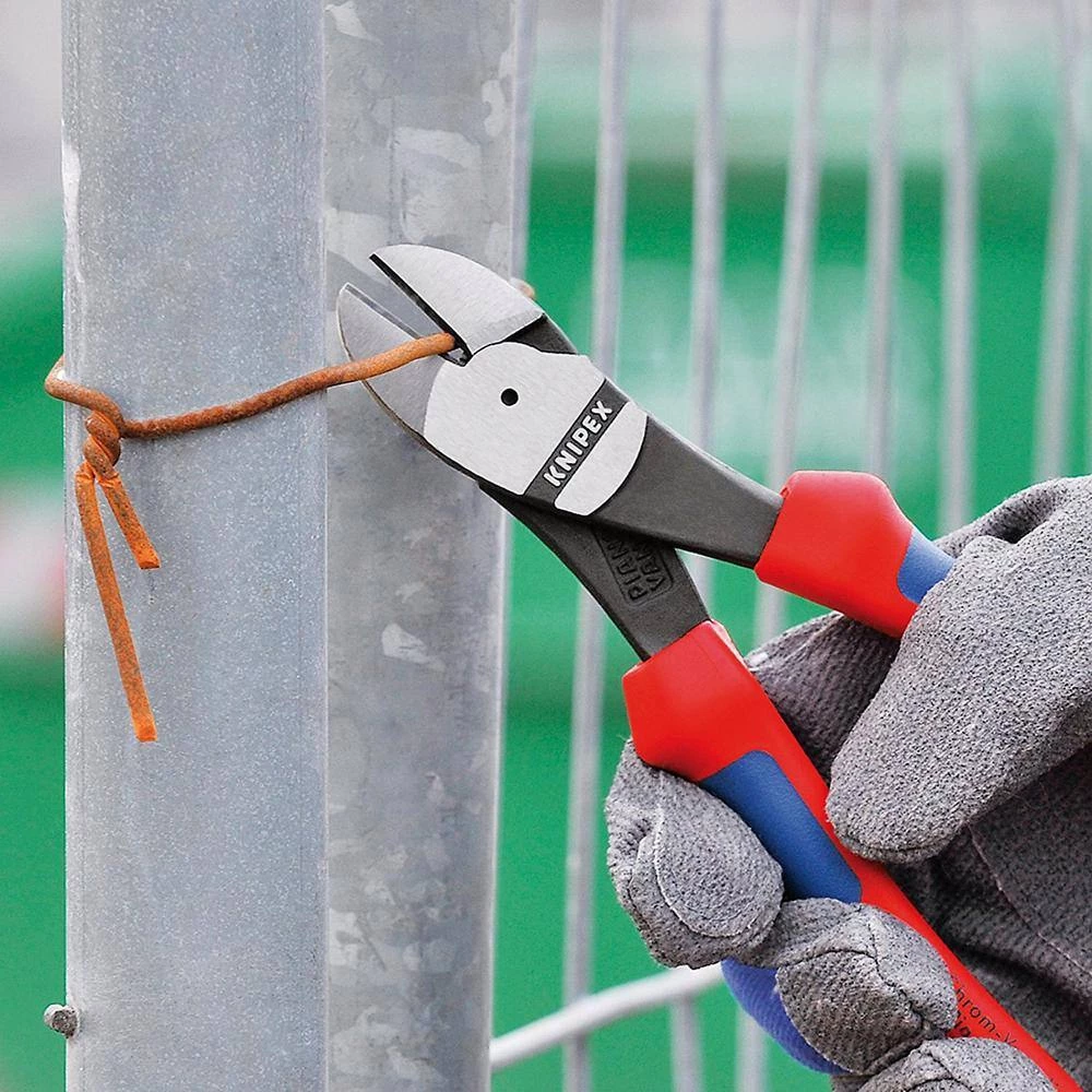 The KNIPEX 10 in. High Leverage Diagonal Cutters are great for very tough, continuous use. The high cutting performance requires 20% less effort compared the conventional diagonal with minimum effort. This is due to optimum co-ordination of the cutting edge angle and transmission ratio. Precision cutting edges (cutting edge hardness approximately 64 HRC) cut several types of wire including piano wire. The added feature of the integrated forged joint axle increases heavy duty performance. Cutting capacities include medium hard to piano wire. The multi-component handles add comfort and ease of use. Made of chrome vanadium heavy-duty steel forged, oil-hardened.