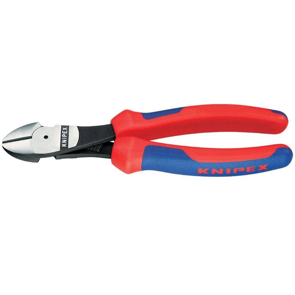 The KNIPEX 5-1/2 in. High Leverage Diagonal Cutters are great for very tough, continuous use. The high cutting performance requires 20% less effort compared the conventional diagonal with minimum effort. This is due to optimum co-ordination of the cutting edge angle and transmission ratio. Precision cutting edges (cutting edge hardness approximately 64 HRC) cut several types of wire including piano wire. The added feature of the integrated forged joint axle increases heavy duty performance. Cutting capacities include medium hard to piano wire. Made of chrome vanadium heavy-duty steel forged, oil-hardened.
