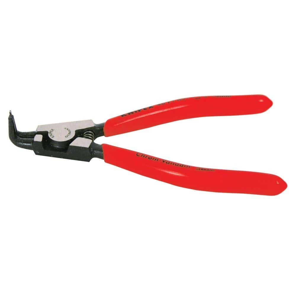 The KNIPEX External 90° Circlip Pliers are for fitting circlips on shafts, range of application from 1/8 in. 3/4 in. (3 mm 10 mm) diameter. The solid style, forged Pliers have a non-slip, solid tips. Pliers body and tips are made of chrome vanadium steel forged, oil-hardened.