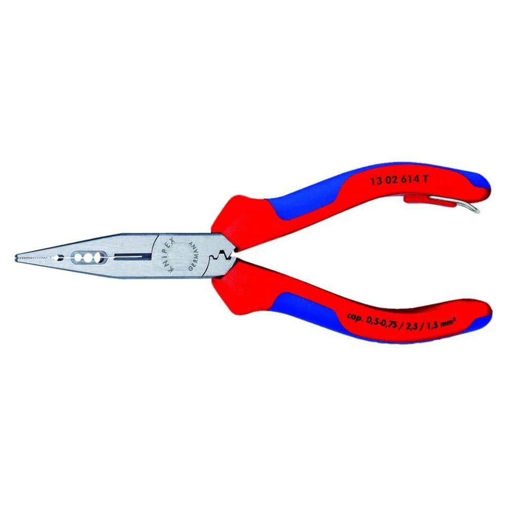Knipex Tools is the worlds largest manufacturer of professional pliers since 1882. Knipex Pliers, Cutters, Insulated Tools and other products have been the tools of choice for Professional Tradesmen and end users who are serious about their hand tools and demand industrial quality. Knipex Tools are made from start to finish utilizing the highest quality materials. Based in Germany, Knipex Tools are German engineered to produce a tool unmatched in the industry in terms of features, comfort, design and performance. The Knipex 13 02 614 T BKA 8 in. 6-in-1 Electricians’ Pliers features dual-component comfort grip handles and tethering attachment. Tethered tools provide effective protection against accidents caused by falling tools. Flat mounting point does not get in the way during normal work on the ground. Not to be used on a lanyard of 5 ft. or more. German vanadium Electric steel; forged and oil hardened.