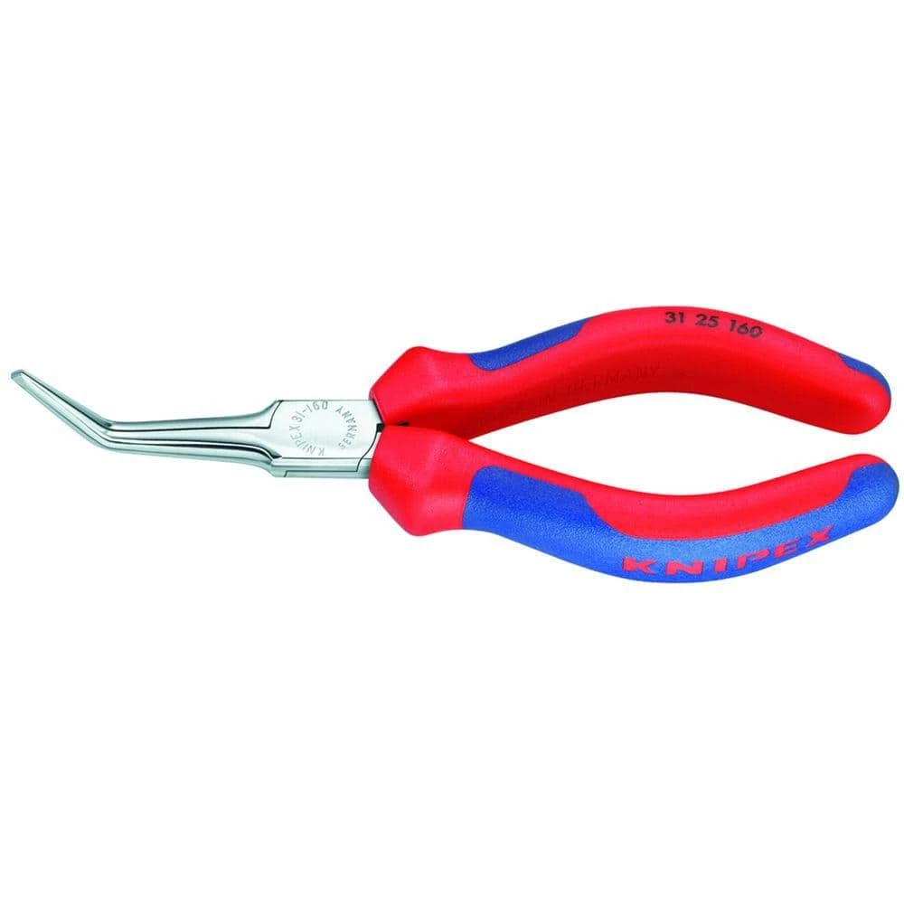 The KNIPEX Needle Nose Pliers have a 45° bend for easy sight of liner and access. The extra 55 mm jaw length is best for precision work. The Pliers are great for assembly, bending and adjusting work. The jaws have smooth gripping surfaces with smooth edges. The multi-component grips add comfort to the grip. The Pliers are chiming plated electric steel, forged, oil-hardened.