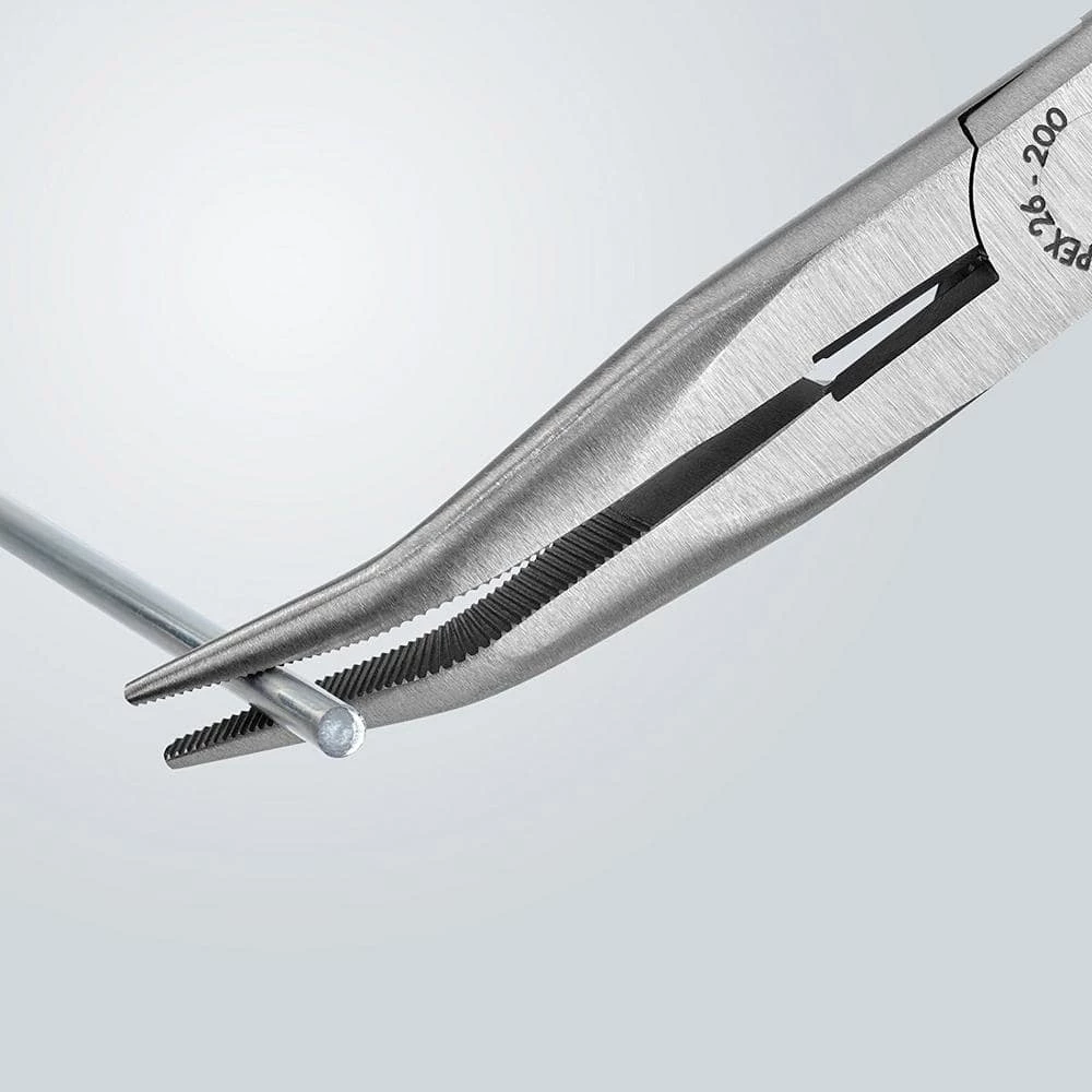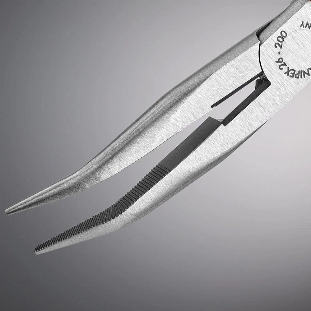 The 40-degree bent nose Snipe Nose Side Cutting Pliers has high loadable, elastic precision points. The comfort grip handles are made of 2 color dual component material. The half-round, long jaws have serrated gripping surfaces. The cutting edges are induction hardened to approximately 61 HRC and will cut medium hard wire maximum diameter 3.2 mm and hard wire with a maximum diameter 2.2 mm. Made of vanadium electric steel forged, oil-hardened.