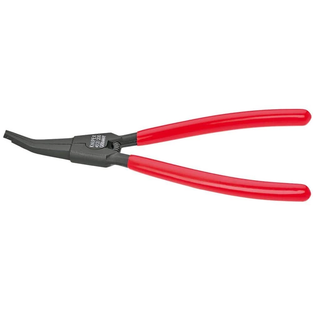 The KNIPEX special retaining ring Pliers with 30° angled are designed for fitting horseshoe-shaped spring retaining rings and circlips without grip holes greater than 12.0 mm. Designed for retaining rings with a minimum split ring gap of 2.2 mm. The with opening spring provides easy use. Made of chrome vanadium electric steel, forged, oil-hardened.