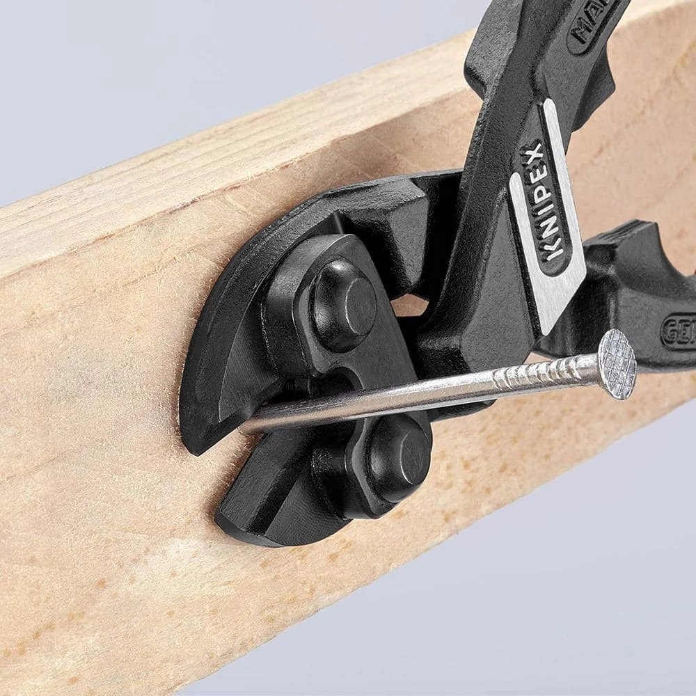The KNIPEX High Leverage CoBolt Mini Bolt Cutters are with a designed with a cutting-edge recess or notch near the joint to keep thicker wire in a better cutting position. The precision cutting edges will cut soft and hard wire. Cutting capacity: maximum 4 mm for hard wire. Cuts material like bolts, nails, rivets, etc. up to 5.2 mm diameter. Exceptional cutting performance with minimum effort because of new lever action design providing a 20:1 ratio. Cutting edges are induction hardened, cutting edge hardness approximately 64 HRC. The return spring and multi-component handles add comfort and ease of use. Made of chrome vanadium heavy-duty steel forged, oil-hardened.
