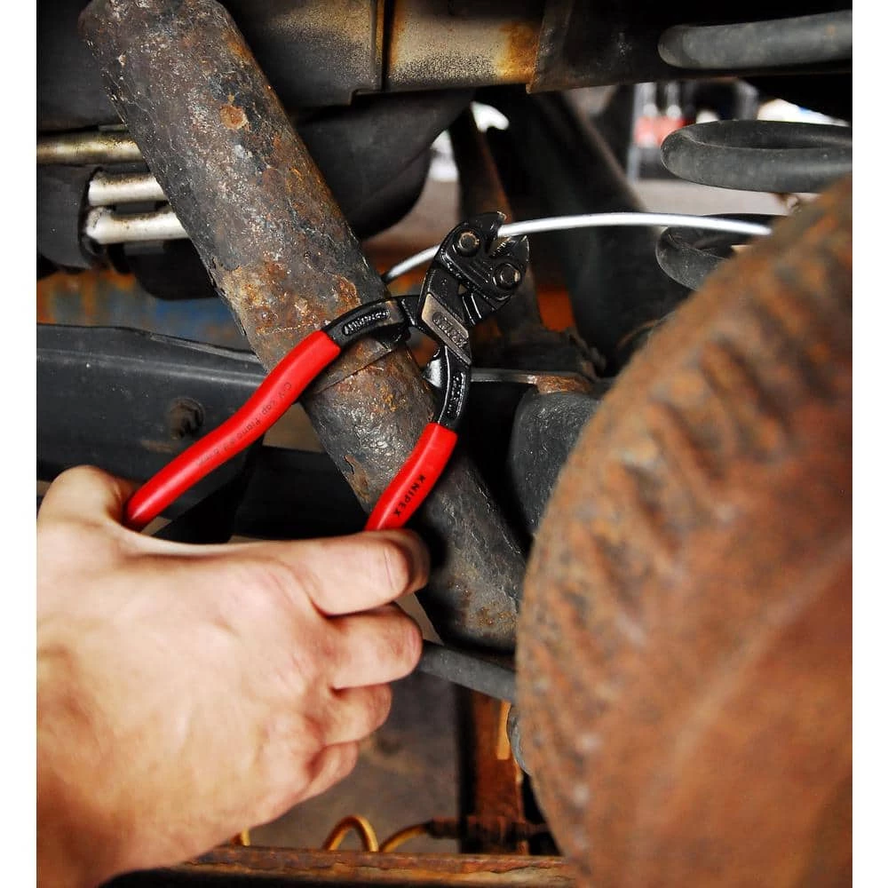 The CoBolt High Leverage Fencing Pliers with cutting edge recess (notch) include reduced cutting-edge hardness to allow more pressure on the sides of the cutting edges (e.g. for making fences). The precision cutting edges are great for soft and hard wire. Cutting capacity: maximum 4 mm for hard wire. Cuts material like bolts, nails, rivets, etc. up to 5.2 mm Dia. Exceptional cutting performance with minimum effort because of new lever action design. Cutting edges additionally induction hardened, cutting edge hardness approximately 62 HRC. Made of chrome vanadium heavy-duty steel forged, oil-hardened.
