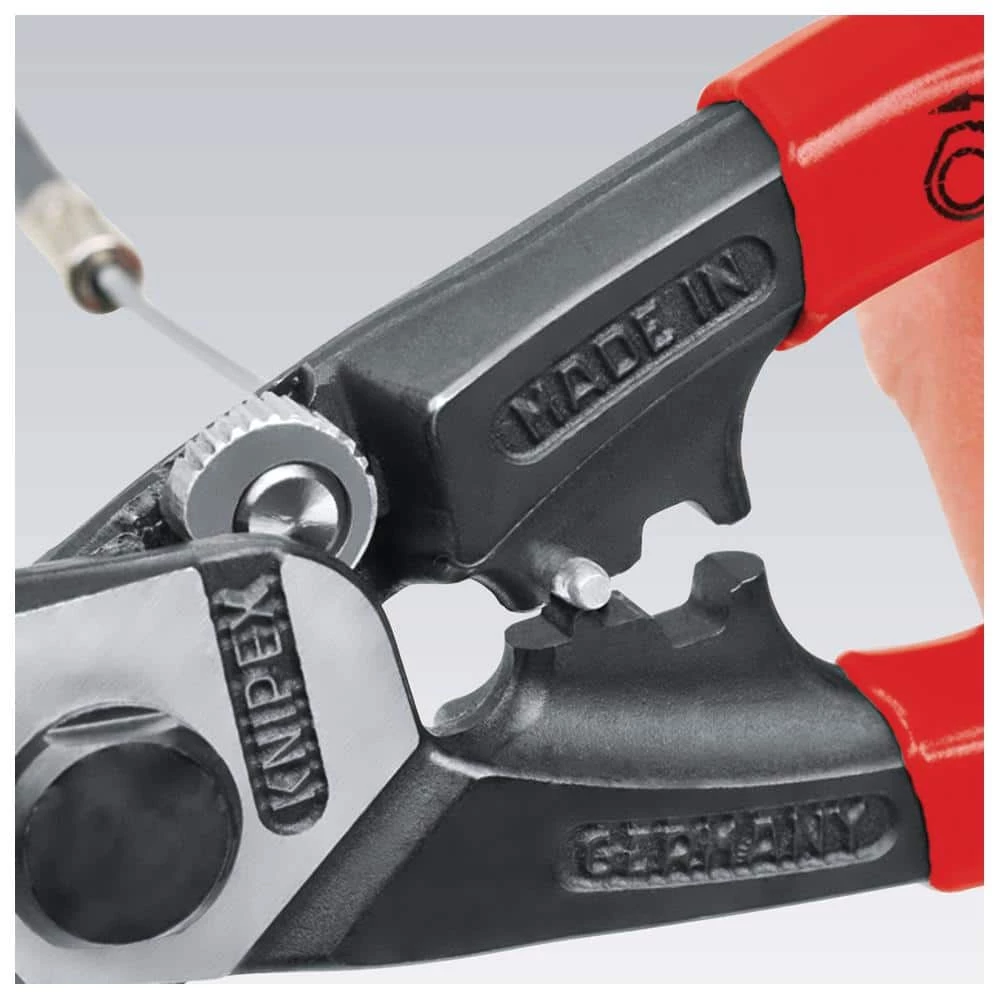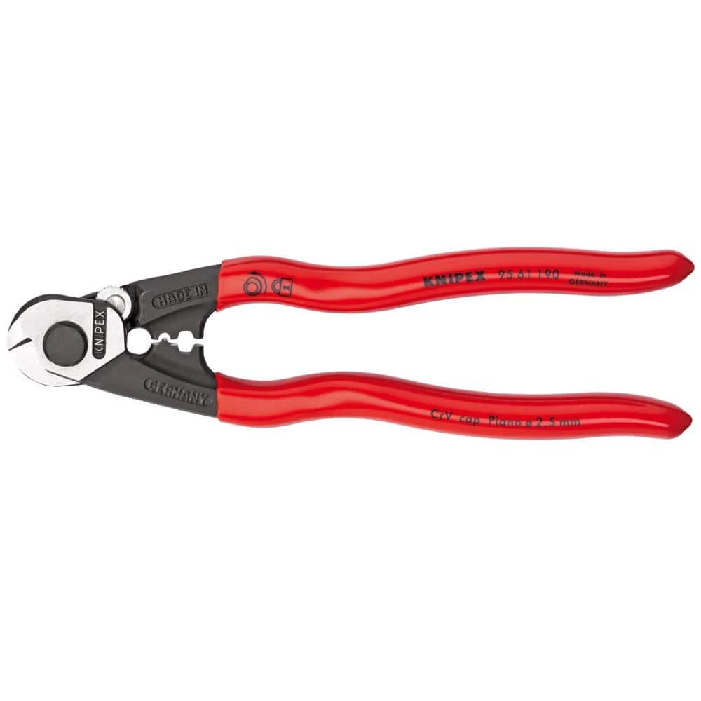 Since our founding in 1882 Knipex Tools has become the worlds largest manufacturer of professional pliers. Knipex Pliers, Cutters, Insulated Tools and other products have been the tools of choice for Professional Tradesmen and end users who are serious about their hand tools and demand industrial quality. Knipex Tools are made from start to finish utilizing the highest quality materials. Based in Germany, KNIPEX Tools are German engineered to produce a tool unmatched in the industry in terms of features, comfort, design and performance. The 95 61 190 is a 7-1/2 In hand held Wire Rope Cutter. Shearing action produces clean precise cuts. Easily cuts bicycle cable, wire rope, etc.