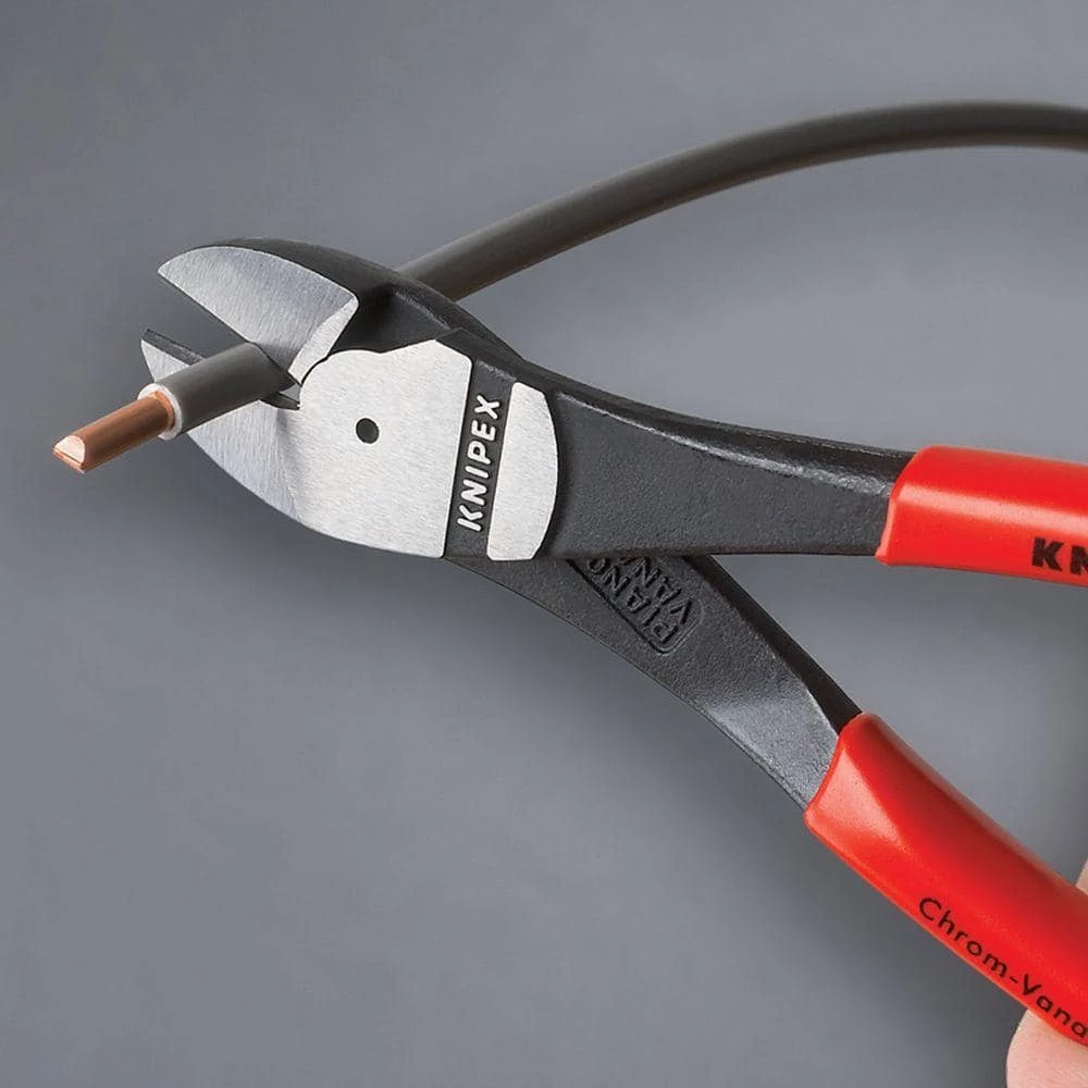 Knipex Tools is the worlds largest manufacturer of professional pliers since 1882. Knipex Pliers, Cutters, Insulated Tools and other products have been the tools of choice for Professional Tradesmen and end users who are serious about their hand tools and demand industrial quality. Knipex Tools are made from start to finish utilizing the highest quality materials. Based in Germany, KNIPEX Tools are German engineered to produce a tool unmatched in the industry in terms of features, comfort, design and performance. The choice of material (Chrome Vanadium), lever ratio and cutting edge angle mean that KNIPEX – High Leverage Diagonal Cutters are particularly designed for the cutting of hard wires. Fixed, forged-on axle for work under continuous stress. Requires 21 Percent less effort.